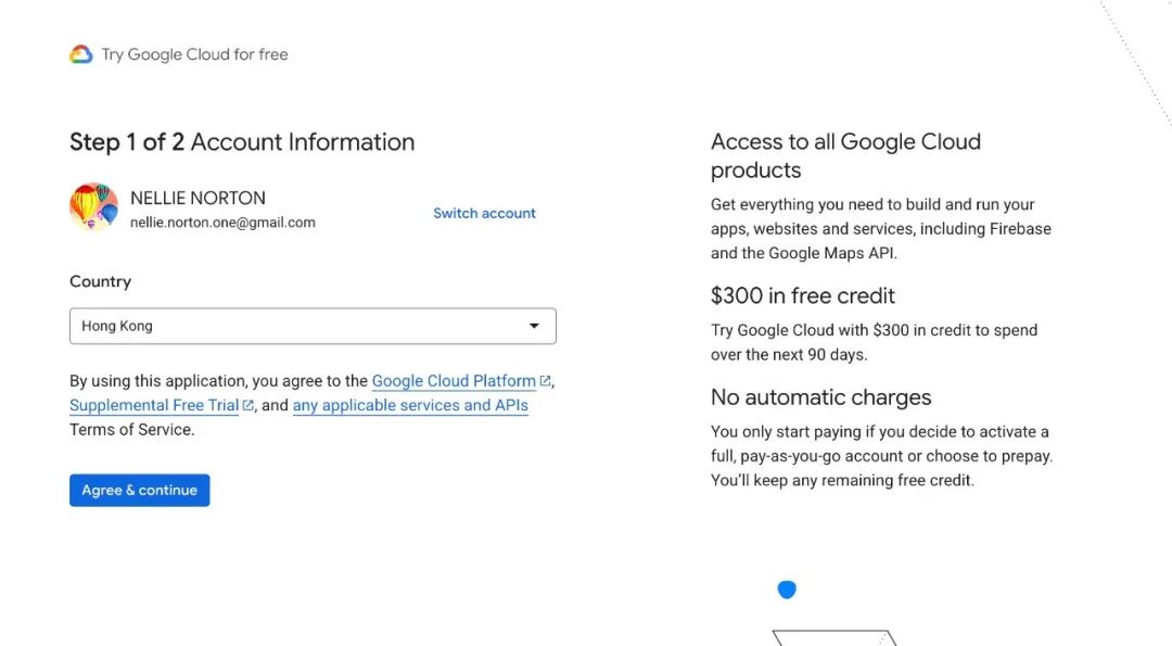 访问 https://cloud.google.com 你可以看到上面显示着可以获取 $300 的赠金。点击免费开始使用,只要你的账号之前没有用过 Google Cloud 就都可以。