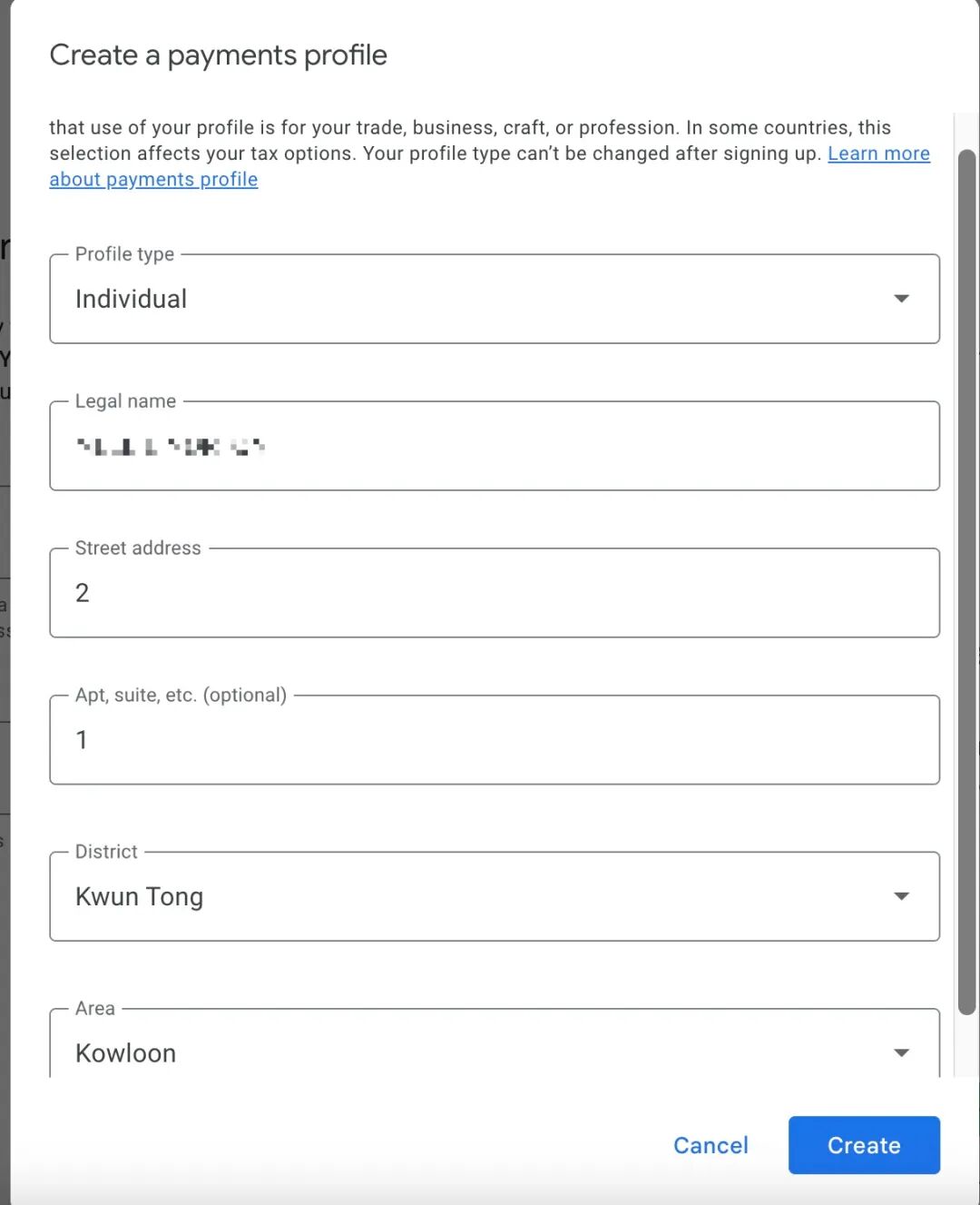2、 payments profile :地址我都是随便填的,貌似都可以,但是 Legal name 要和信用卡的名字一样。