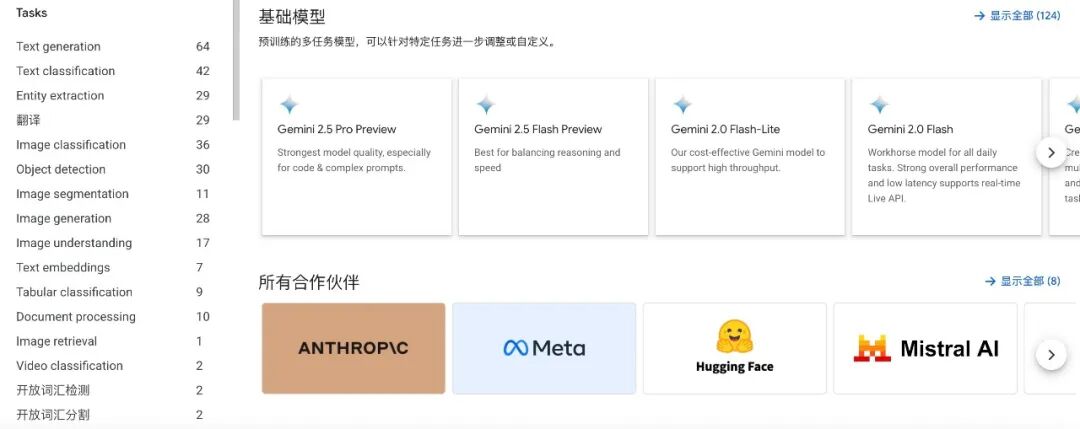 Vertex AI 是一个机器学习 (ML) 平台,它允许您训练和部署机器学习模型和 AI 应用,以及自定义大型语言模型 (LLM)。它的模型库除了自家的 Gemini,还有 Authropic、Meta 等等的大模型。