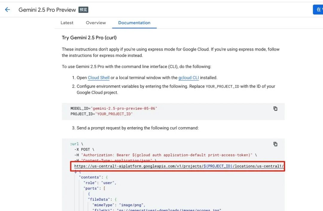 这也是 标准 Vertex AI 的 API 格式:https://{location}-aiplatform.googleapis.com/v1/projects/{project}/locations/{location}/{model}:generateContent