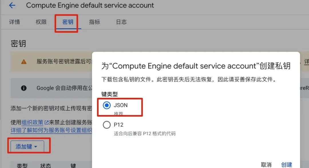 没有服务账号的话,创建一个,然后在密钥这里添加密钥,添加一份 JSON 类型的文件,然后会生成一份文件供你下载。一定要保存好这份文件。