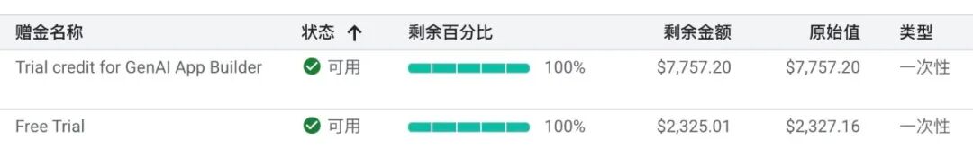 另外还有个叫 Trial credit for GenAI App Builder 赠金,给了我 7000 多刀,似乎是在开通 GenAI 功能的时候给的,如果你看到了可以开通看看。这个有效期为一年。