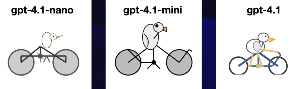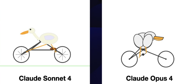 SimonW 使用了一个很有意思的基准测试方式:,他的 Prompt 是:Generate an SVG of a pelican riding a bicycle(生成一个鹈鹕骑自行车的SVG图像)